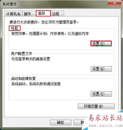 3、打開系統屬性后,切換到“高級”選項卡,然后點擊性能中的“設置”按鈕,如下圖所示: