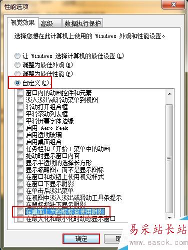 4、在性能設置窗口中,選擇“視覺效果”選項卡,然后點擊“自定義”,在下方的功能設置中找到“在桌面上為圖標標簽使用陰影”功能,將其取消勾選,最后點擊“應用—確定”,如下圖所示: