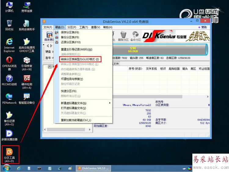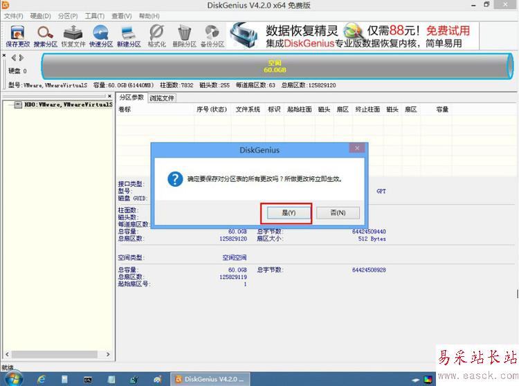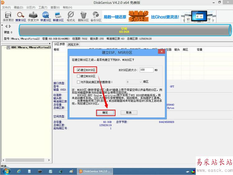 這里要注意的是,如果你當前硬盤已經有數據了,且不想影響數據,則請下載DiskGenius專業版,并運行64位專業版。因為PE里的DiskGenius是免費版,不支持在數據無損的情況下MBR轉GPT或GPT轉MBR。這里實驗的環境是空硬盤,所以直接建立GPT分區。如下圖: