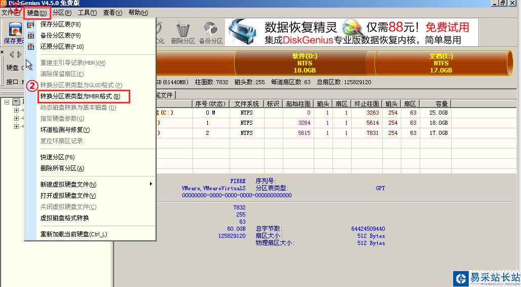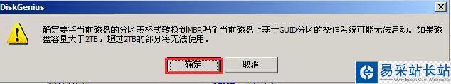 4、刪除完成后,找到“硬盤”菜單,并在該選項中找到并點擊“轉換分區表類型為MBR格式”,在彈出提示框中選擇“確定”,如下圖所示: