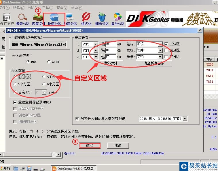 6、分區表轉換格式后,需要對硬盤重新分區,點擊“快速分區”,在彈出的界面中可以自定義一些設置,如劃分幾個盤,每個盤多大容量等。設置完成后點擊“確定”(橢圓圈起來的部分為自定義區,大家可以根據自己的需要去設置),如下圖所示: