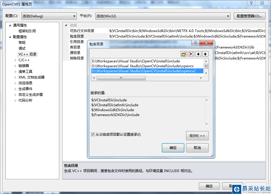 2、打開OpenCV01項目屬性,依次選擇“配置屬性”->“VC++目錄”->“包含目錄”,添加相應路徑;