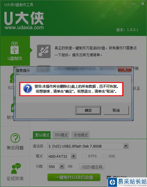 2.點(diǎn)擊一鍵制成USB啟動(dòng)盤之后,彈出提示信息框,詢問(wèn)在操作的時(shí)候會(huì)將U盤上的所有數(shù)據(jù)全部清除,有重要數(shù)據(jù)的請(qǐng)?jiān)诓僮髑皞浞荨@^續(xù)一鍵制作USB啟動(dòng)盤點(diǎn)擊確定,退出點(diǎn)擊取消,在這里選擇點(diǎn)擊確定,如下圖: