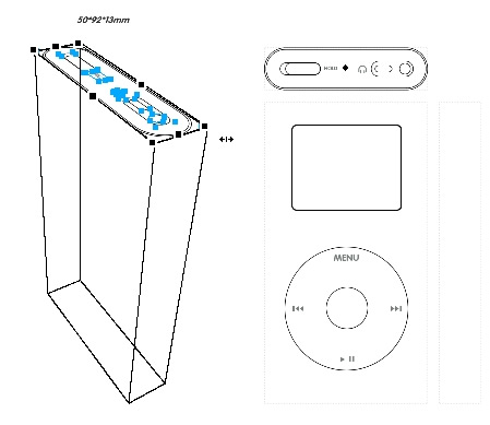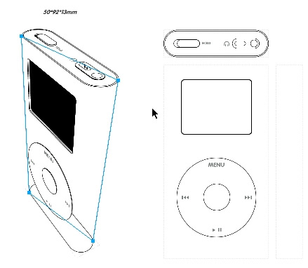9.然后把這個四邊形連同上面,下面 三個矢量組合,組合形成的矢量就是整個ipod再我們視野的大小了,換句畫說 如果你的ipod不是透明的,我們不能看到這個形狀背后的內容,所以我們給他一個邊框,填充為白色: