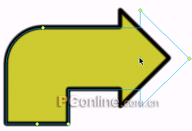 當我們選中該點進行調整的時候,不會出現相應的背景提示框。但是奇妙的事情是我們可以向下、向左右方向進行拖拽了(不能向上,也就是說,不能比箭頭的現有水平高度還小),形成了彎角箭頭,如下圖所示: