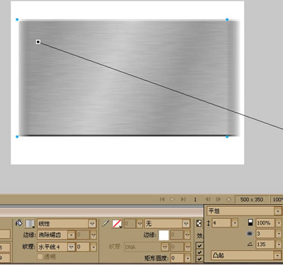 2.(主要設置部分)設置完漸變以后在屬性板的效果選項里選新增雜點。在彈出來的屬性框里的數量選15 然后繼續在效果選項屬性板選運動模糊,在彈出的屬性面板里選角度180.距離30。 然后繼續在效果選項框選斜角和浮雕→內斜角屬性是(形狀:平坦寬度:4柔化:3角度135對比度100%按鈕預設:凸起) 得到的效果如圖2