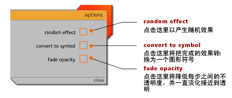 options:此菜單控制最終輸出時(shí)的幾個(gè)參數(shù),你可以在此設(shè)置不同步數(shù)之間的不透明度變化值,可以設(shè)置變換效果是否是隨機(jī)的,或者可以將最終的輸出效果轉(zhuǎn)換為符號(hào)。