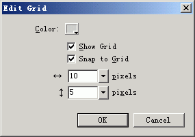 下面我們將根據上述設計分析,分不同的部分為您介紹制作過程。在新建一個文件后,我們需要對我們的工作環境進行簡單的設定,以符合我們的任務要求。首先需要設定工作區的面積及背景顏色,打開modify>canvas size針對常見的800x600分辨率,我們設定工作區的長為776這可以根據需要設定,但最好不要超過778,高為515根據實際內容確定,再執行modify>canvas color設定背景色為黑色。再打開view>grid>edit grid對話框,設定水平方向網格間距為10像素,垂直方向為5像素,并將網格顏色設為暗灰色以不影響觀察頁面,打開網格顯示和網格捕捉。如下圖所示: