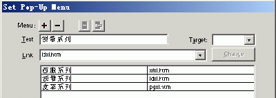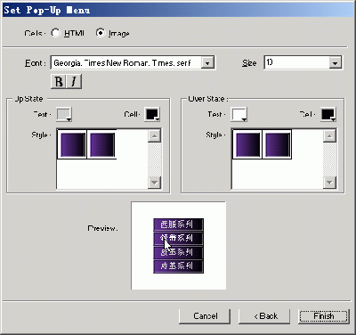 6、 當您選擇了image格式時,需要在下部的兩個窗口設置up和over狀態(tài)的菜單樣式,您的懸想也許和我們這里的不同,這是因為我們使用了自定義的樣式文件。我們可以根據(jù)不同設計項目的需要將自定義的樣式作為彈出菜單的選項。