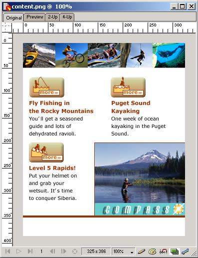 content.png文件是一張大圖片,但是已經(jīng)被切割為很多個(gè)小矩形。如果想要了解更多關(guān)于創(chuàng)建切割的信息,請(qǐng)查看fireworks幫助(fireworkshelp)中的使用熱區(qū)和切割(usinghotspots and slices)。