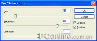6、執行effect -->adjust color -->hue/saturation效果命令,在彈出的hue/saturation設置框中進行設定如下圖所示,記得勾選上colorize選項。