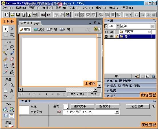 新建文檔完成后就可以看到fireworks的工作界面了,如圖。 fireworks的工作界面由“菜單欄”、“工具欄”、“工作區”、“工具條”、“組合面板”和“屬性框”六個部分組成。