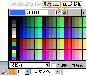 顏色樣版——在描邊顏色預覽窗中可以選擇一種色彩作為路徑的描邊色。預選的色彩及該色彩的網頁色數值都會在樣版的左上角中顯示出來。同時也可以直接輸入想要的網頁色數值,然后按“回車”即可;