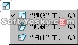 點選“縮放”工具后在文本框內會出現八個控制點和一個縮放的中心點,當鼠標移到控制點上時指針會變成雙向箭頭,此時拖動該控制點即可改變對象的形狀,如圖5—05、5—06。當按住alt鍵的同時拖動控制點時,對象則會以縮放點為中心,使對象產生對稱式的縮放變形。