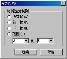 復制到幀:單擊該項,如圖6—09。可把某幀在畫布上的對象復制到其它的幀上。也可以在對話框中輸入復制幀的“范圍”。