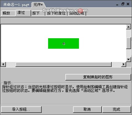 “滑過”選項卡是繪制當鼠標移動到按鈕上及按下時,按鈕所呈現的狀態。在這里我們可點擊“復制彈起時的圖形”按鈕,將“釋放”選項卡中的按鈕圖形復制過來,然后只更改其色彩,以便區分。如圖8—05。或者你也可以在此繪制你想要的其它圖形。