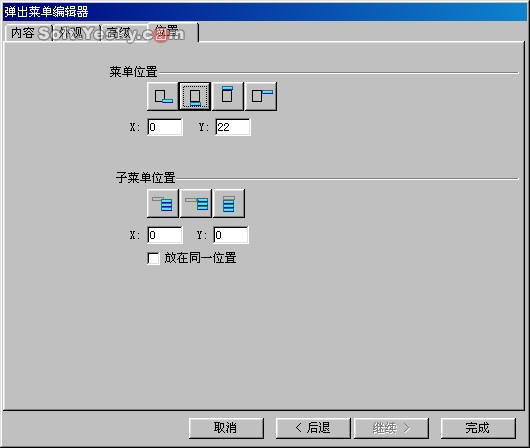 子菜單位置——選擇子菜單的彈出位置,同樣也可以在下面的坐標中直接輸入相關(guān)數(shù)值。而取消“放在同一位置”選項時,則子菜單總會與它的上一級菜單在同一水平位置上彈出。