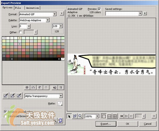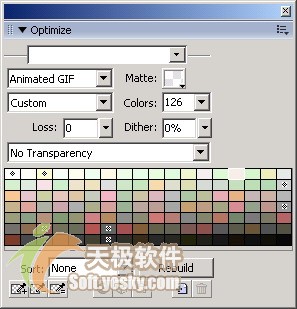 在導出文件類型中選擇gif動畫選項,用戶可以通過設置matte(色版)、colors(顏色)、dither(抖動)、透明度等選項來達到對顯示效果的優化。