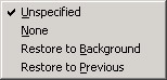 * restore to background(恢復到背景):刪去當前幀的圖像,恢復背景面積顏色或者圖案。適合在一個透明的背景中移動對象。