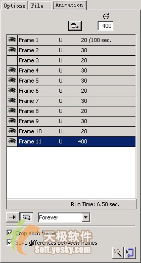 選中一個或者多個幀,在導出預覽對話框的“animation”選項欄有上方的幀延時中,我們同樣可以設置幀的顯示時間,如圖5所示。另外根據當前導出的幀數和每一幀的延遲時間,我們還可以知道動畫播放一次所需要的時間,這個時間會被顯示在選項欄中幀項目的右下角,如圖6所示。