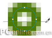我們再來繪制它的嘴吧。先畫一個5*5大小的圓,取消其填充色,選用2像素的柔化描邊,描邊色為# 4b7801。然后用“路徑切割”工具將該圓一分為二,如圖27。