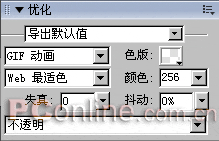 而第二帖的延時時間則設置為14/100秒。然后我們再來查看播發效果,可能有人又覺得慢了些。其實當我們把這一動畫導出為gif動畫圖片后,你再用acdsee之類的看圖軟件去查看時會發現其播放速度要比在fireworks中查看時稍快一些。因此還是先把該動畫導出為gif格式后再來查看。用“切片”工具將畫布范圍進行框選。然后在“優化”面板中選擇導出格式為“gif動畫”,顏色為256色,如圖20。