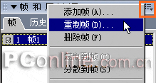 為了使這個靜態表情能夠動起來,我們要先建一個畫布大小為65*65大小的新文檔,然后將組成“放大鏡”表情的所有對象選中并復制到這個新畫布上來。接著再啟動“幀”面板。在面板的右上方點擊其下拉菜單,從中選擇“重制幀”項,也就是復制幀的意思。如圖16。