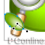 我們再來給它畫一個簡單的小手,好拿住放大鏡。用“橢圓形”工具畫一個20*11的橢圓。采用“橢圓形”漸變填充,色彩的漸變值由#ffffff至# 76ae00,描邊色為# 669309的1像素柔化。然后重新啟動數值變形對話框,將該對像進行40度的旋轉。然后將這個小手移到放大鏡左側位置,如圖13。
