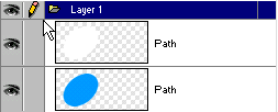 ![]() | 第二、選中變形后的橢圓,"edit-->clone" ,克隆一個新的橢圓,將其填充色改為白色(這個顏色就是將來你要產生對比效果的顏色,可以隨自己的需要來變動),克隆后的白色橢圓的位置和藍色橢圓位置重合。層面板如左圖所示。 |