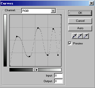第七步、 關(guān)鍵的一步!選定該文字對象,繼續(xù)進(jìn)行effect效果設(shè)定。選用其中的adjust color--curves效果命令。在隨后彈出的設(shè)定框中,進(jìn)行相應(yīng)的調(diào)整如圖06所示:(注意:調(diào)節(jié)的光源節(jié)點(diǎn)越多,出現(xiàn)的效果就會越奇妙,當(dāng)然生成的文件也會相應(yīng)更大些)
