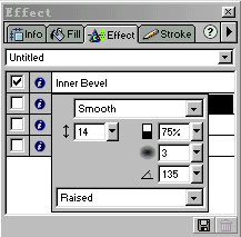 第六步、 選中文字對象,打開effect(效果)面板,執(zhí)行其中的bevel and emboss--inner bevel(斜角和浮雕--內(nèi)斜角)效果命令,在隨后彈出的設(shè)定框內(nèi)進(jìn)行相應(yīng)設(shè)定如下:斜角方式采用smooth(平滑);斜角寬度大小為14像素,其余各項(xiàng)保持默認(rèn)值不變。具體設(shè)定方式請參考圖05: