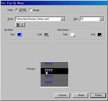 在此,讓我詳細地介紹一下以上窗口的內容。cell欄:那是菜單選項的格式,html是html文本格式,而image是指圖片格式。選擇不同,會有不同的效果。在此,本人較贊成用圖片格式,因為那看起來較漂亮些。下面的是字體和字號的選擇,這隨你喜歡啦!up state是指鼠標放到按鈕時的字體設置和菜單格的設置,overstate是指鼠標放到菜單欄時字體的設置和菜單格的設置。你可以選擇一種你喜歡的格式。preview是預覽欄,因為該軟件對中文支持不好,所以顯示為不正確,你可以不管它,因為導出時是正常的。之后,按“finish”搞定。完成這些設置后,按“文件”菜單的export選項,導出html文件,這樣你可以預覽啦!嘩,是不是很酷呢!如圖5