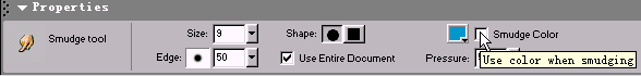對于涂抹工具屬性面板上的各個屬性選項,我們這樣來理解: size--涂抹點區(qū)域大小;shape--涂抹點區(qū)域形狀;edge--涂抹點邊緣柔和度;use entire document--是否應用于整個打開圖像;pressure--涂抹點壓力大小設定;smudge color--是否使用涂抹額外添加顏色。