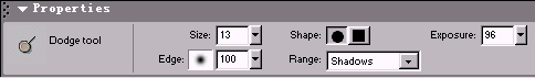3、dodge tool(加亮工具)。該工具是用來加強像素顏色的亮度的,就象使用一塊海綿在顏色塊兒中吸掉一些水分,使顏色變淺、變亮。選定該工具后,相應的properties屬性面板會如下圖所示: