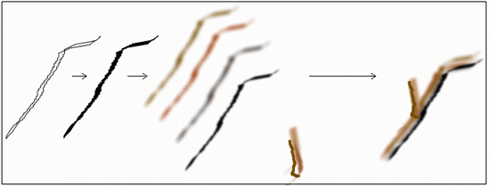 需要說明的是不可太急,制作時充分考慮寫意畫的特點,“濕筆”、“枯筆”的效果都要有。調節羽化值的大小和節點的尖銳與平滑程度來達到這種效果!