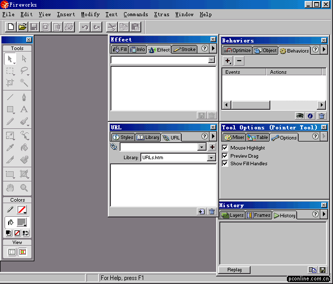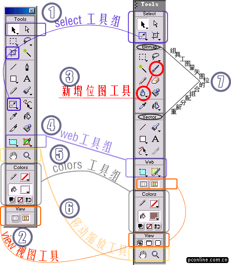 3、增強的工具面板。在fw4,我們就已經發現了mm公司已經有意識的在工具面板的布局上做了一些相應的歸類擺放;在fwmx中,我們可以發現工具箱的分類更加詳細了——select選擇工具組、bitmap位圖工具組、vector矢量圖工具組、view視圖切換等等……,為了便于大家的理解,我們可以通過下面的圖片來直觀的理解一下fwmx較fw4的不同之處:
