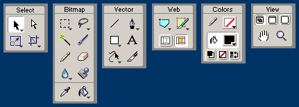 新的工具面版(tools panel)將不同類型的工具分開排列,分別有選擇工具(select)、位圖工具(bitmap)、矢量工具(vector)、網(wǎng)絡(luò)工具(web)、顏色工具(colors)、視圖工具(view),這樣更方便用戶選擇恰當(dāng)?shù)墓ぞ邅硎褂谩?br>