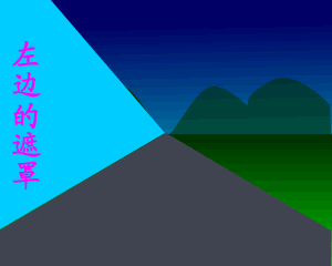 3.在工具面板中用鋼筆工具,勾畫出山的輪廓,填充色為深綠色,把它edit>clone克隆,modify>fransform>flip horizontal水平翻轉,移動右邊,透明度設為60.效果如圖