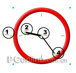 b、2號點:選中該點,會出現背景提示框:“hour(小時)”,用鼠標拖動該控制點,就可以調整鐘表時針的停留位置了!幾點了?通過調整該點就可以實現了。