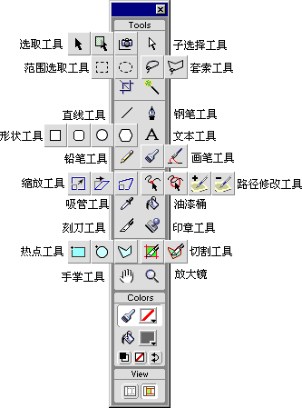 工具條上包括各種選擇、創建、編輯圖象的工具,有的工具按鈕的右下角有一個小三角,說明這個工具包含有幾種不同的形式,按住這個工具不放就能顯示其他的形式。