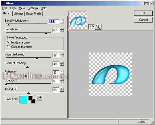 【注意】“glass”濾鏡是需要安裝了完整的eye candy 4000濾鏡后才會(huì)出現(xiàn)的,fw mx 2004本身并沒有附帶這種濾鏡,這點(diǎn)希望大家注意。