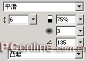 5、按“ctrl+a”組合鍵,接著按“ctrl+g”組合鍵,將兩個(gè)對(duì)象組合為一個(gè)群組對(duì)象。接著選擇屬性面板上效果菜單中的“斜角和浮雕|內(nèi)斜角”效果命令,在彈出的設(shè)置框進(jìn)行如下圖所示的設(shè)定。