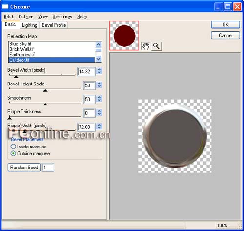 4、仍然是選中位于層面板上部的圓形對象,選擇屬性面板上效果菜單中的“eye candy 4000 le|bevel boss”效果命令,在彈出的“bevel boss”設置框中進行具體設置,各個參數的具體設置如下圖所示。