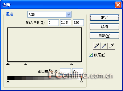 7、選擇屬性面板上效果菜單中的“調整顏色|色階”效果命令,在彈出的“色階”設置框中進行如下圖所示的具體設定。
