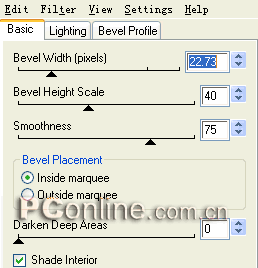 5、繼續選擇屬性面板上效果菜單中的“eye candy 4000 le|bevel boss”效果命令,在彈出的“bevel boss”設置框中進行具體設置,各個參數的具體設置如下圖所示。