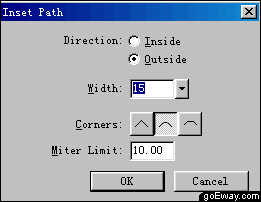 width是指角度的寬度。corners項(xiàng)用來設(shè)定擴(kuò)張后和路徑的彎角方式,從左至右分別是:"尖角"、"圓角"、"棱角"。miter limit項(xiàng)用于設(shè)定擴(kuò)張后的路徑在彎角處的角度限制。