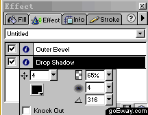 六、 還是在effect面板中,在下拉菜單中選擇shadow and glow->drop shadow,并進行如下圖一樣的設置。