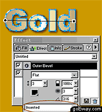 五、打開effect(效果)面板,在下拉菜單中選擇bevel and emboss->outer bevel。類型為flat,深度為3,透明度為100%,柔化值為3,角度316,最重要的是下面有紅筆圈出來的地方,在下拉菜單中選擇inverted。