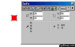 二、 選擇工具面板中的矩形工具,按住shift鍵,畫(huà)一個(gè)正方形,填充顏色為紅色,打開(kāi)info面板,設(shè)置其w和h的值都為20,按回車表示確認(rèn)。
