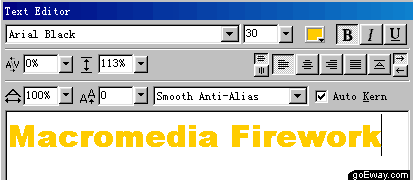三、選擇工具面板中的文字工具,在文字編輯器中選擇字體為arial black ,大小為30象素,顏色為黃色,加粗。在輸入窗口輸入macromedia fireworks這幾個英文字母。輸入完后,點擊ok按鈕。并把文字放在綠色的矩形上面。按ctrl+c鍵。